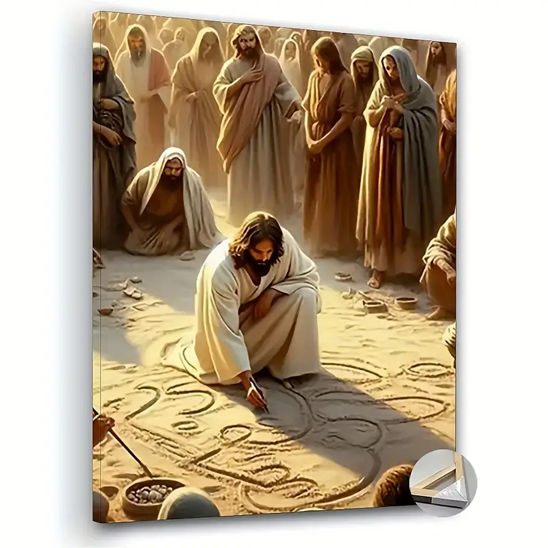 1pc Elegant Wooden Framed Jesus Sand Writing Scene Canvas Wall Art – Serene Biblical Artwork with Warm Tones, Ready to Hang Spiritual Decor for Living Room, Office & Home, Religious Home Decor, Serene Room Accent, Historical Artwork, 2D Flat, Perfect for Room Decor