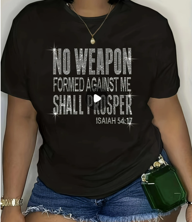 Women’s Plus Size Casual Rhinestone Letter T-Shirt – “No Weapon Formed Against Me Shall Prosper” Isaiah 54:17 – Crew Neck Short Sleeve, Knit, Black with White Text, Comfortable & Stylish for Casual Attire, Ladies T Shirts